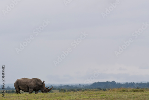 a southern white rhino grazing with the Olpejeta landscape in the horizon.