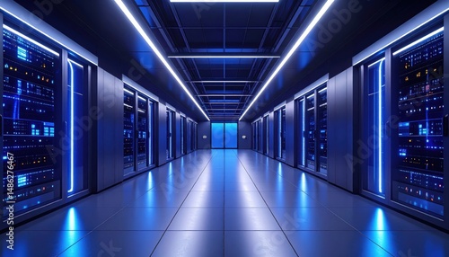 A spacious corridor filled with high tech servers emits a vibrant blue glow, creating a modern vibe.