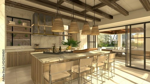 kitchen, farmhouse, modern, interior, design, home, decor, wood, cabinet, island, window, garden, contemporary, rustic, style, light, airy, elegant, luxury, breakfast, bar, chair, countertop, appliance, stove, sink, faucet, tile, floor, grey, brown, white, green, plant, natural, bright, clean, comfortable, stylish, luxury home, architecture, color image, dining, elegance, fashionable, flooring, furniture