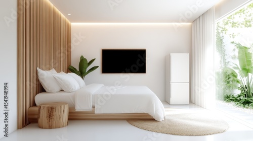 A spacious, minimalist bedroom featuring a warm-toned wooden headboard and serene plants, epitomizing tranquility and modern elegance in interior design.