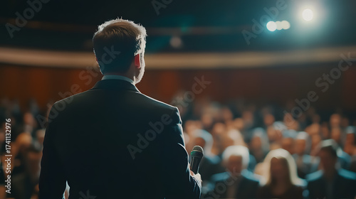 A speaker delivers a presentation to an audience in a conference hall, with the background slightly blurred.