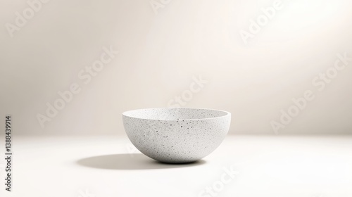 A speckled white bowl sits on a white surface. The bowl is round and shallow, with a slightly textured surface. Its photographed against a plain white background, with soft, even lighting. The image i