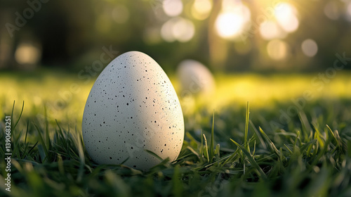 A speckled white egg rests gently in vibrant green grass bathed in the warm golden light of a sp sunrise creating a peaceful Easter scene.