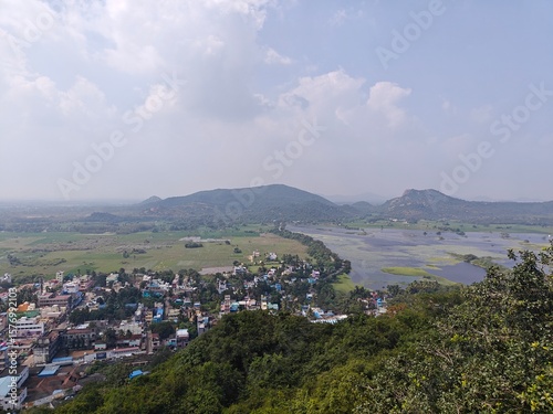 A spiritually resonant view of Thirukazhukundram, Tamil Nadu, India, capturing both the hilltop Vedagiriswarar Temple and the ancient foothill temple complex. The hill temple, dedicated to Lord Shiva,