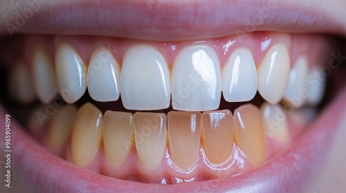 A split view of a person teeth, showing the significant difference before and after a whitening treatment, with enhanced brightness