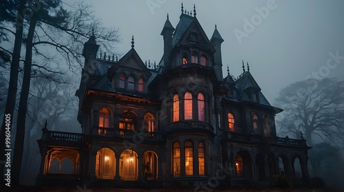 A spooky Gothic Style mansion in the middle of a dark, foggy forest.