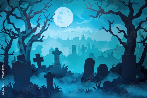 A spooky graveyard at night with tombstones, fog, and ominous moonlight Graveyard At Night Spooky Cemetery