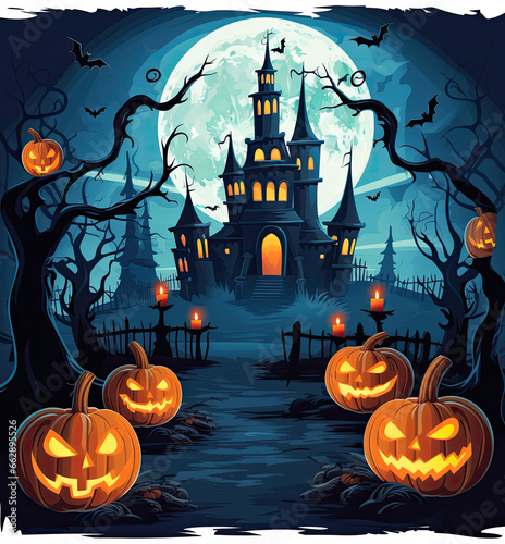 halloween, pumpkin, night, moon, autumn, bat, holiday, horror, vector, castle, house, skittish, tree, scarey, illustration, dark, celebration, silhouette, october, haunted, sorcerer, design, card, party, cartoon