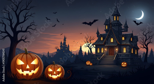 A spooky halloween night with a haunted mansion and glowing pumpkins