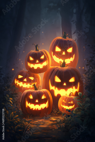 A spooky Halloween scene featuring glowing jack-o'-lanterns stacked in a dark forest
