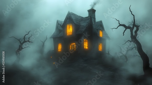 A spooky haunted house with glowing windows, surrounded by fog and twisted trees, isolated on a misty gray background