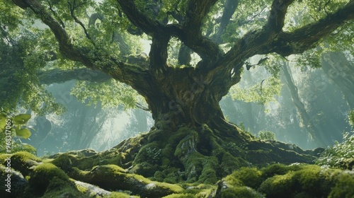 A sprawling tree in an ancient forest, with moss-covered roots and branches extending in every direction.