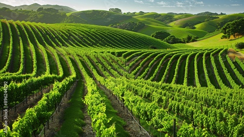 A sprawling vineyard with rows of grapevines stretching across rolling hills, showcasing the beauty and precision of viticulture.