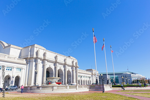 A square in front of the Union Station Building in Washington DC, USA. Facade of the Union Station Building with marble statues on top of columns on a sunny afternoon.
