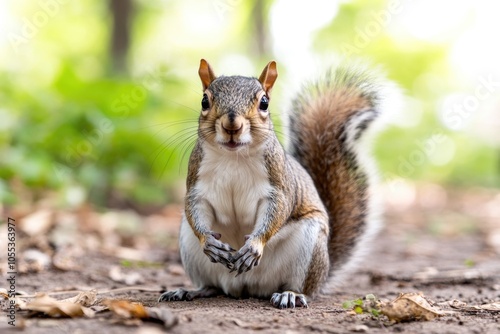 A squirrel sits on the forest floor, surrounded by trees and foliage