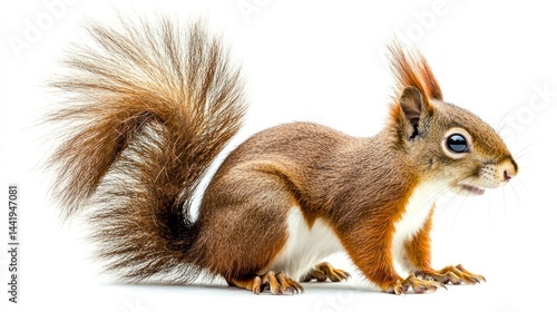 squirrel, standing, fluffy, tail, against, white, animal, rodent, mammal, red, wildlife, cute, nature, wild, fur, chipmunk, eating, animal, forest, nut, small, brown, tree, isolated, park, funny