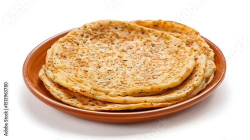 A stack of flatbreads with herbs on a terracotta colored plate isolated