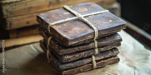 A stack of handmade raw cacao bars with rustic wrapping, artisanal style
