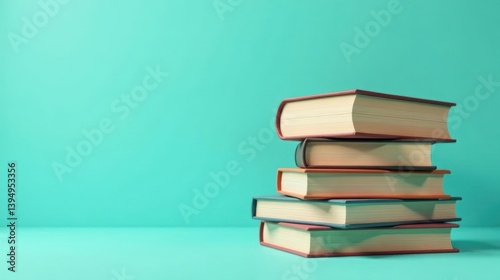 A stack of hardback books with neutral-toned pages rests on a teal surface against a matching backdrop.