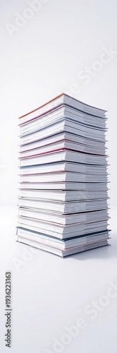 A stack of pristine binders, angled to create a geometric cascade on a pure white stage, illuminated with relentless brightness, angled view, sharp focus