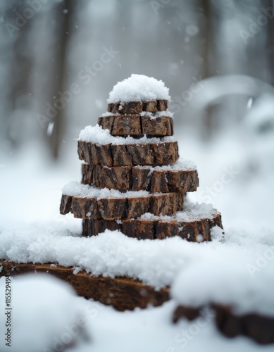 A stack of wooden blocks covered in snow in the woods