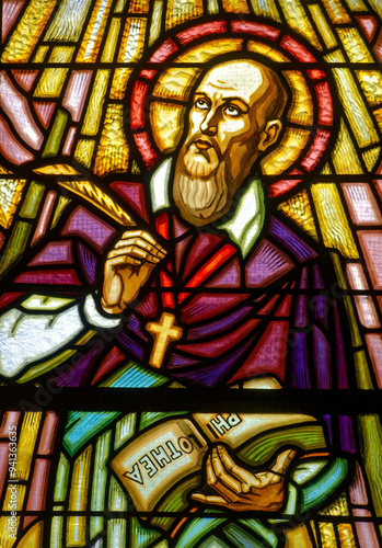 A stained glass of Saint Francis de Sales, founder of the Visitation Order. Vitrail de Saint François de Sales, fondateur de l'ordre de la Visitation.