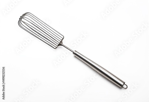 stainless, steel, spatula, on, a, plain, white, background, with, no, other, object, or, in, the, frame, has, long