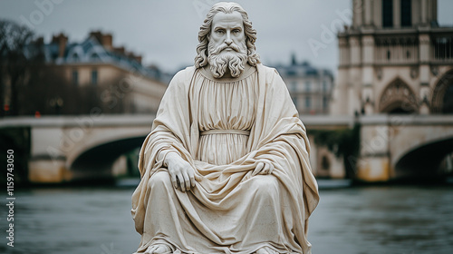A statue of a seated figure near a bridge by the river, with cloudy skies.