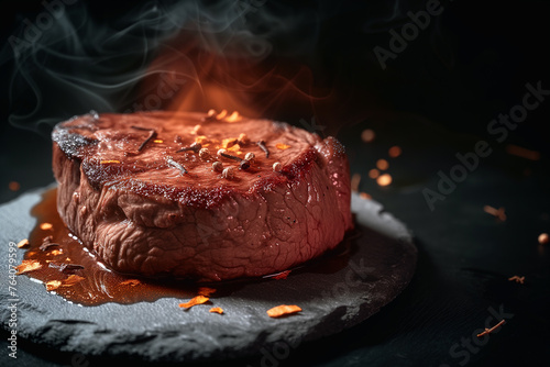A steak is on a black stone plate, surrounded by smoke and chili peppers