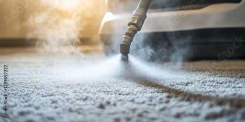 A steam cleaner is spraying water on a carpet. The steam is white and the carpet is white