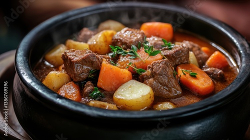 A steaming bowl of beef stew with tender chunks of meat,