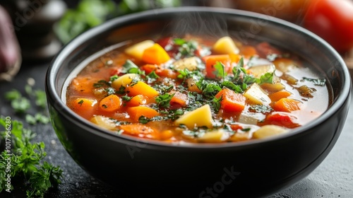 A steaming bowl of hearty vegetable soup richly filled with assorted vegetables like carrots, potatoes, and herbs, ideal for a comforting meal on a chilly day.