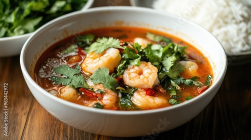 A steaming bowl of hot and sour shrimp soup with vibrant red chilies, fresh cilantro, and juicy shrimp, served with a side of jasmine rice.