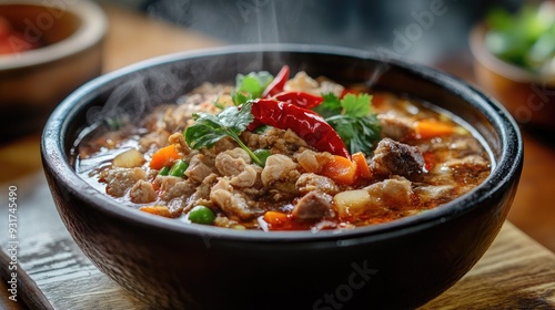 A steaming bowl of Mala soup, filled with an assortment of meats, vegetables, and spicy broth, garnished with chili peppers.