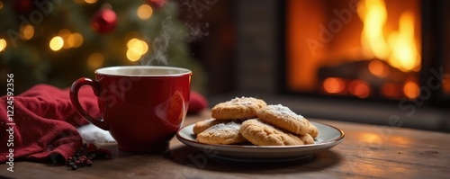 A steaming cup of coffee and a plate of Christmas cookies in front of a cozy fireplace, holiday, coffee, cozy