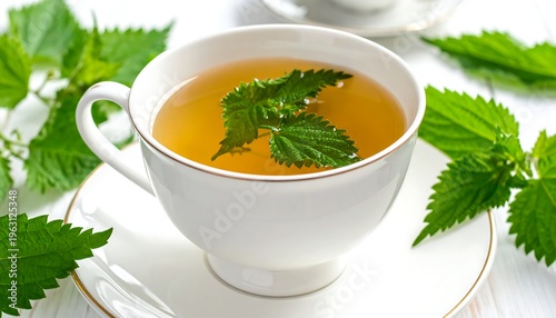 A steaming cup of herbal tea with green leaves