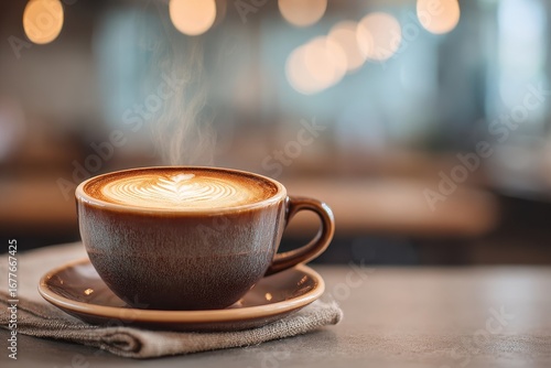 A steaming hot latte coffee with elegant foam art, set in a cozy cafe ambiance.