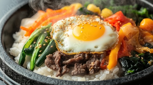 steaming, plate, space, left, side, text, colourful, mix, vegetable, beef, egg, over, bed, rice, served, sizzling, hot, stone, bowl, vibrant, colours, hearty, presentation, emphasize, tradition, favor