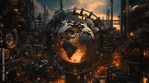 industrial, mechanical, gear, cog, globe, trade, commerce, ai, automation, vintage, brass, copper, machinery, victorian, invention, innovation, technology, clockwork, steam, pipe, metallic, economy, finance, globalisation, connectivity, industry, transportation, factory, smokestack, historical, engraving, intricate, detailed, craftsmanship, marketplace, mercantile, futuristic, cybernetic, hybrid, anachronism, artistry