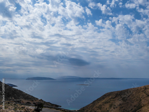 A steep and dangerous road down leading to Stara Baska Beach. Thick clouds above. Beautiful coastal line of Croatia. Beach is surrounded with tall hills from each side. Hidden gem of Croatia.