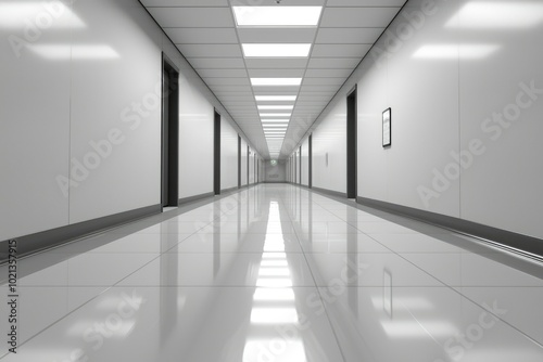 white, corridor, hallway, sterile, clean, bright, light, fluorescent, light, ceiling, tile, tiled, floor, shadow, door, door, wall, wall, frame, picture, empty, modern, minimalist, interior, design, architecture, perspective, straight, long, narrow, office, hospital, clinic, building, space, room