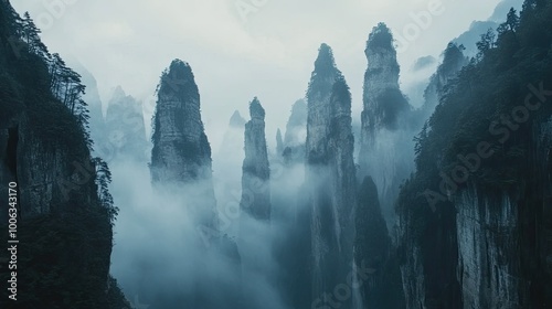 A still image of Zhangjiajies Avatar Mountains, captured on a misty day without tourists, emphasizing the mystical beauty of the towering peaks.