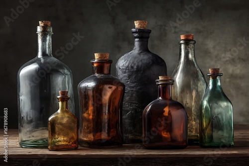 A still life composition of vintage glass bottles with cork stoppers on a rustic wooden table against a dark, textured backdrop.