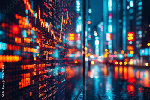 A stock market graph and financial data displayed on a digital screen with a city background. business concept photography. Digital art illustrations.