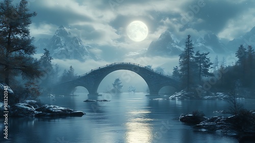 A stone bridge arches over a still lake, with snow-capped mountains and a full moon in the background. The scene is serene and mystical.