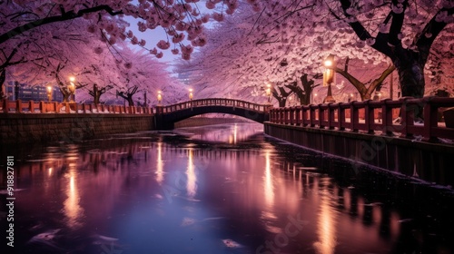 bridge, canal, cherry blossom, tree, night, evening, light, lamp, street, stone, water, pink, flower, floral, blossom, beautiful, tranquil, nature, landscape, city landscape, romantic, scenic, japan, asia, spring, travel, tour tourism, park, garden, outdoors, peaceful, serenity, calm, peace, love, romance, dreamy, magical, soft, delicate, elegance, twilight, dusk, sky, urban, city