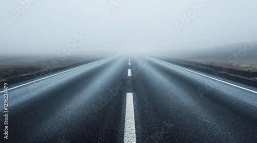 A straight highway vanishing into dense fog, with the road markings barely visible through the mist.