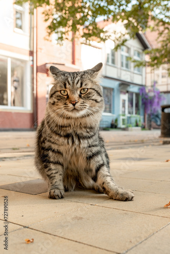 a street cat on the background of the old town. a stray animal. a well-groomed street cat.