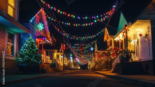 A street lined with houses adorned with colorful Christmas lights, creating a magical, glowing atmosphere that captures the holiday spirit.