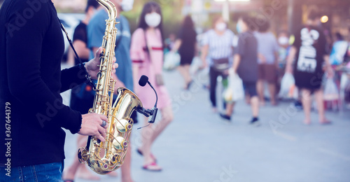 A street musician plays the saxophone and wearing face shield with blurry many people wearing mask and walking in Bangkok, Thailand.